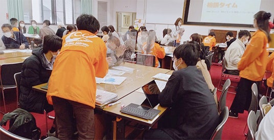 学生スタッフがテーブルごとに新入生や保護者の質問に答えています