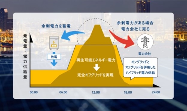 太陽光パネルをマンションの屋上に設置し、発電した電力を各住戸へ供給します。日中に発電した電力を大容量の蓄電池に溜めて日没後に供給します。それでも足りない部分のみを電力会社から供給し、「ハイブリッド型」の運用を行うことで環境にも貢献し、さらにコストの安い電気を供給することができます。