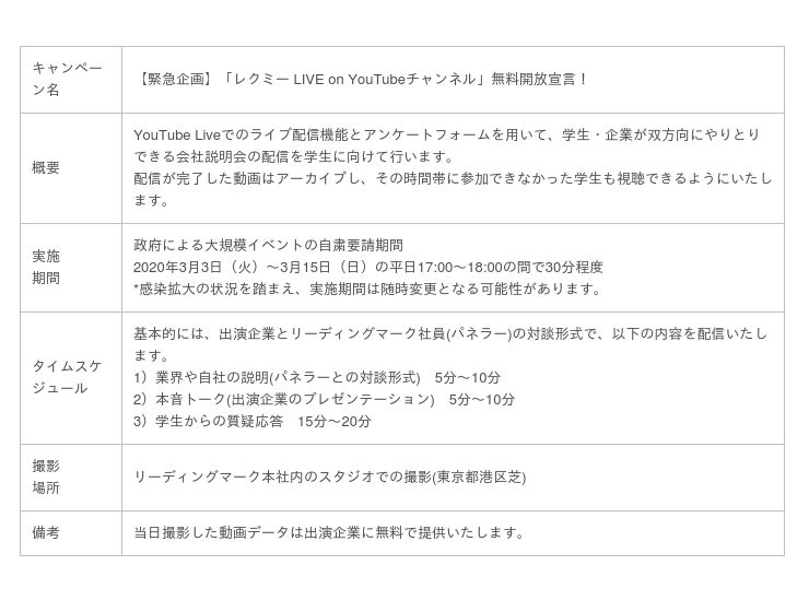 また、その結果を踏まえ、YouTubeにレクミーチャンネルを開設し、「レクミー LIVE on YouTube」と題して、企業説明会をライブ配信することに決定いたしました。学生の利用料は無料、2020年3月中は企業の利用料も無料といたします。