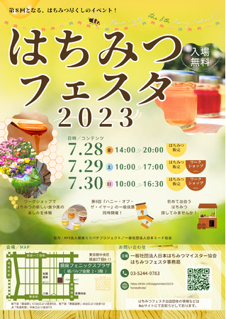 はちみつの資格を運営する一般社団法人日本はちみつマイスター協会(東京都中央区、代表理事:河村千影)は、はちみつの日(8/3)の直前の週末にはちみつの様々な使い方が学べて、各地のはちみつが購入できるイベント「はちみつフェスタ2023」を開催いたします。2020年、2021年は東京オリンピックと日程が重なったため、2022年はコロナ禍のため開催を見合わせておりました。そのため、4年振りの開催となります。