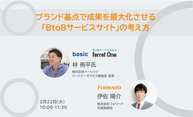 企業のブランド戦略を支援する株式会社フォワード(本社:東京都中央区、代表取締役:伊佐 陽介)は、導入実績1,000社を超えるオールインワン型BtoBマーケティングツール「ferret One」を展開する、株式会社ベーシック パートナーサクセス推進室 室長 林侑平氏をゲストにお迎えした特別セミナーを2022年2月22日(火)にオンラインにて開催致します。