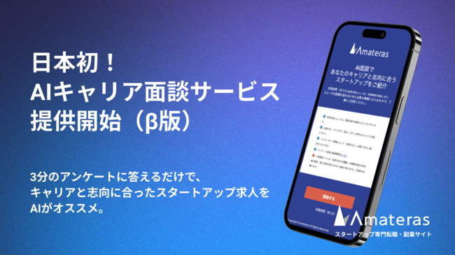 スタートアップにコアメンバーとして参画するための転職・副業サイトを運用している株式会社アマテラス(本社:東京都目黒区、代表取締役:藤岡清高)は、スタートアップへの参画を希望する登録者向けに、スタートアップ求人の提案に特化したAIキャリア面談サービス(β版)の提供を先月より開始致しました。