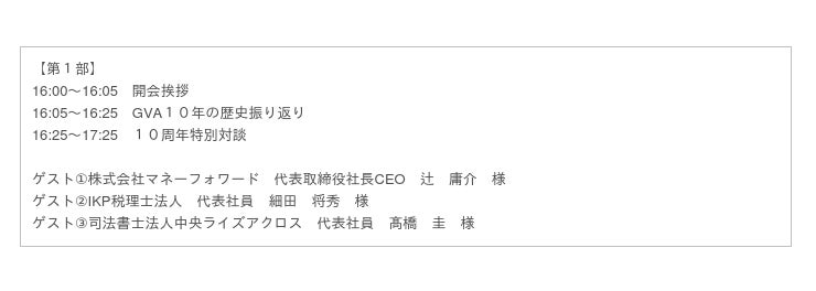 本日16時から、これまでのGVAを支えて下さった方々をゲストとして、マネーフォワードCEO 辻氏、IKP税理士法人 代表 細田氏、司法書士法人中央ライズアクロス 代表 高橋氏をお招きし、オンラインでの特別対談を行います。