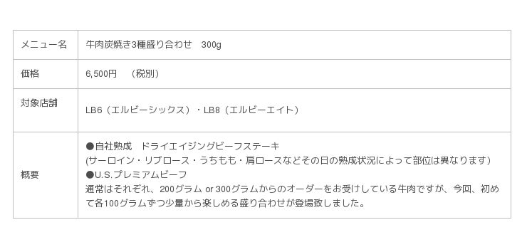 国内、LAに54店舗のレストランを展開をしている株式会社グローバルダイニング(本社:東京都港区南青山7丁目/代表取締役社長:長谷川耕造)は、ワインバー&グリル業態「LB(エルビー)」から“牛肉炭焼き3種盛り合わせ 300g”の販売を開始致しました。その日最高の状態のお肉を3種類、楽しんでいただくことが出来ます。2~3人でも十分の楽しめる“牛肉炭焼き盛り合わせ”を囲んでご友人とワイワイお楽しみください。