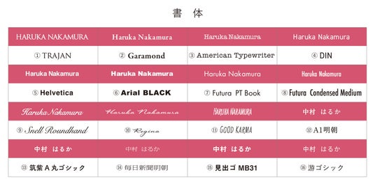印鑑側面・ケース表面に文字を入れることができます。特殊な印刷方法で文字部分が立体的に浮き出ることにより、指で触れると少し凹凸感が楽しめるテクスチャーになっています。文字書体は普段から慣れ親しまれる書体からユニークな書体まで、さまざまな特性をもった欧文フォント(11)、和文フォント(5)の全16種類からお好きな書体をお選びいただけます。