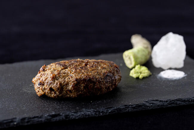 つなぎに小麦粉を一切使用しない「グルテンフリー」と徹底的に「無添加」を極めた、日本一の和牛香(わぎゅうこう)と旨味を凝縮したハンバーグが実現。まずは塩か山葵でいただきます。