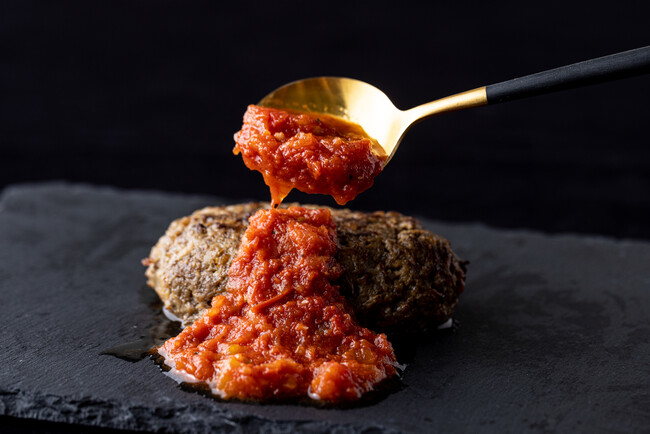 にんにくの香りと玉ねぎの甘さがしっかりと感じられるソースには、イタリア産のトマトを使用。日本の完熟トマトが甘みが強いのに対し、イタリア産トマトは酸味が強いとされています。この酸味が、鹿児島黒牛の強い旨味に最高に合うのです。