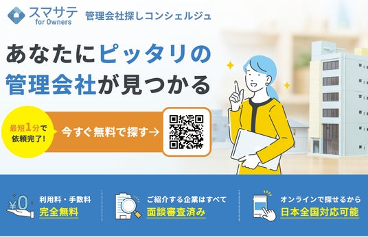 スマサテ管理会社探しコンシェルジュは、利用料無料/簡単な入力で、すぐにあなたにぴったりの審査済み不動産管理会社をご紹介するサービスです。全国対応のため現地に行かなくても専任のスタッフがあなたにおすすめの管理会社探しをサポートします。