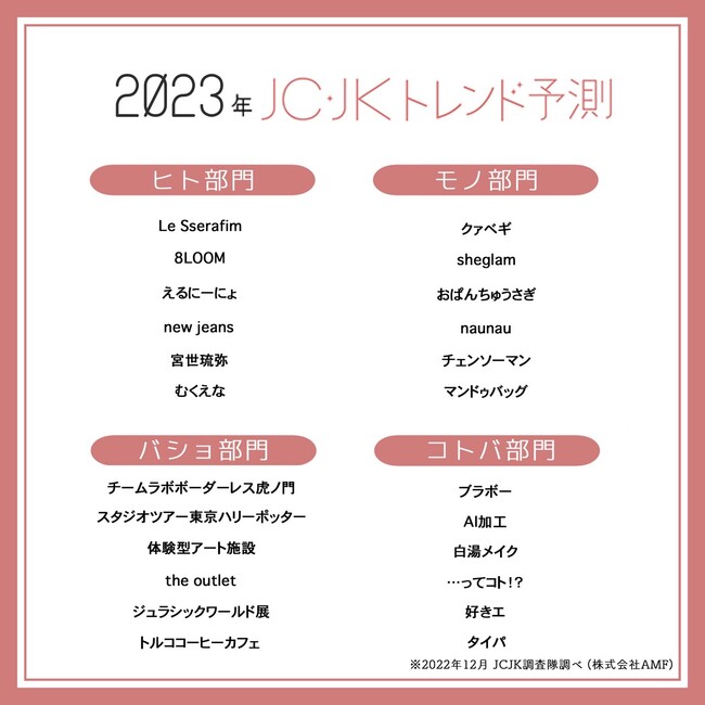 Z世代向けのマーケティング支援などを手がける株式会社AMF(本社:東京都港区、代表取締役:椎木里佳)は、トレンドのリサーチが得意な全国の女子中高生からなるマーケティング集団”JCJK調査隊”の精鋭メンバーの選考結果をもとに、「2023年のトレンド予測」を、「ヒト・モノ・バショ・コトバ」の4部門に分けて発表いたします。