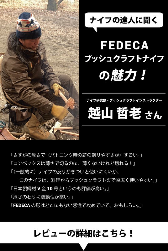空前のキャンプブームをきっかけに、アウトドア活動が文化として定着する中、FEDECAユーザーのなかでも、ナイフ一本で山の中にあるものを使って物を作り、キャンプをする「ブッシュクラフト」を楽しむ方々が増えてまいりました。