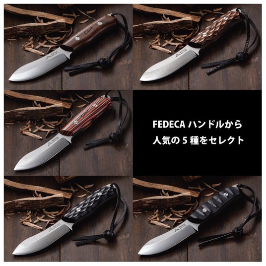 FEDECAの魅力は多彩なハンドルラインナップにあります。今回は中でも人気の5種をセレクト。耐久性に優れた積層強化木4種類と、ウレタン塗装を施したマルチカラーの計5種のラインナップです。