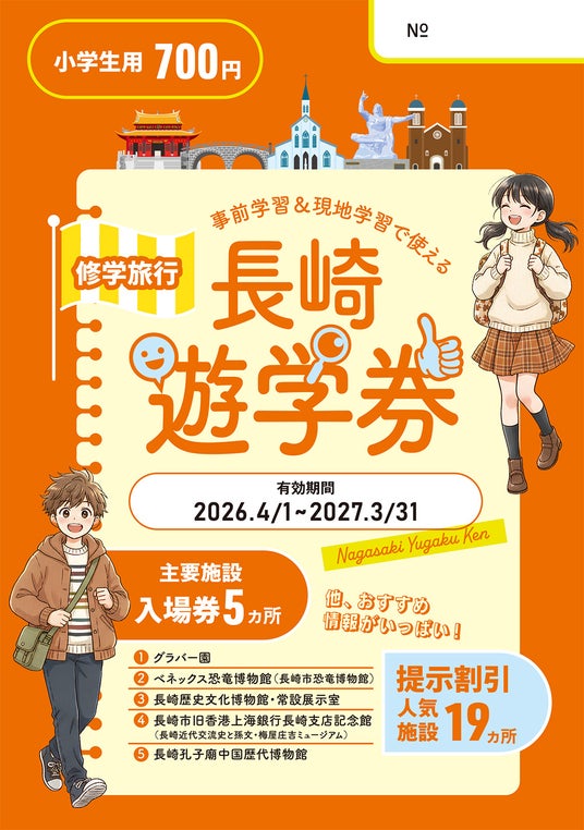 長崎市内の主要観光施設5か所の入場券と、人気観光施設19か所の提示割引と市内情報がまとまった、現地学習に使える冊子です。