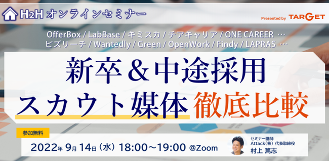 採用支援サービス『TARGET』などを展開するAttack株式会社(本社:東京都品川区、代表取締役:村上篤志)が経営者や採用責任者の方を対象とし、新卒採用や中途採用におけるスカウト媒体に焦点を当てた無料オンラインセミナーを2022年9月14日(水)に開催致します。