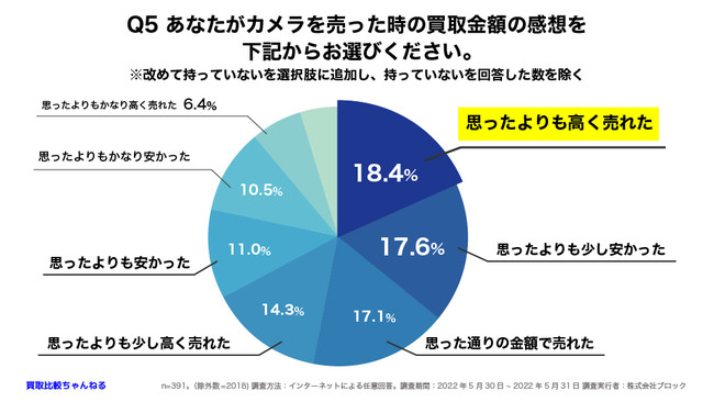 カメラを売ったことがある人のうち、39.1%が想定以上の金額で売れていることがわかりました。