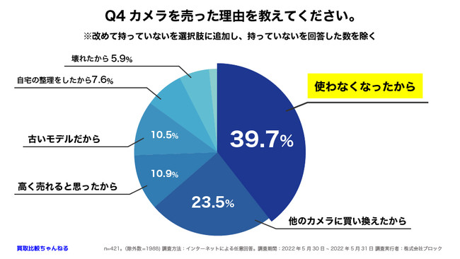 カメラを売ったことがある人のうち、39.7%が使わなくなったことが理由で売っている。