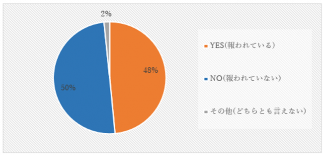 2つ目は「仕事、きちんと報われていますか?」の問いに対しYES(報われている)が48%。NO(報われていない)と回答したのは50%と約半々の結果となりました。