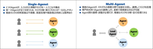 今回発表するマルチAIエージェントは、業務用途に応じて専門性を持つ複数のAIエージェントが役割に応じて、情報収集・判断・応答などの機能を分担して動作するもので、ユーザーからのリクエストに対して、指令役となるリードエージェントが各エージェントの動作を制御・連携させてタスクの並行処理ができます。シングルエージェントでは対応が難しい複雑な業務にも柔軟に対応できるようになるため、問い合わせ業務における回答幅を広げ、AIによる自動化システムの運用を簡素化し、業務効率化およびスムーズで分かりやすい顧客体験を促進します。