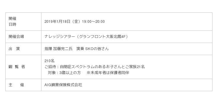 本コンサートはAIG損保がダイバーシティ&インクルージョンの推進を目的に、兵庫県立芸術センターのご協力のもと、自閉症の理解促進活動をおこなう「NPO法人あっとオーティズム」へのチャリティーとして参加者へ寄付をお願いし、計112,500円が集まりました。こちらは、コンサート終了後にNPO法人あっとオーティズムへ全額寄付いたしました。また、コンサートへはチャリティーの趣旨に賛同いただいた210名と自閉症スペクトラムのある子どもたちとそのご家族21名を招待し、みんなで一緒になって、SKOが奏でる素晴らしい音楽を楽しんでいただきました。日本におけるAIGグループの保険持株会社AIGジャパン・ホールディングス株式会社(以下、AIGジャパン)は、2013年から、4月2日の「世界自閉症啓発 デー」に自閉症や発達障がいへの理解を深める活動の一環としておこなわれる、オーティズム(自閉症)啓発キャンペーン「ライト・イット・アップ・ブルーJapan」(運営NPO法人あっとオーティズム)へ継続した支援を行っています。