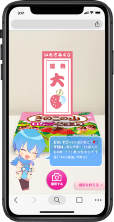 スマートフォンで対象商品のパッケージにARカメラをかざすと、すとぷりメンバーがあなたの目の前にランダムで1人登場。『すとぷりいちごみくじ』を引くと、「すとぷり」が