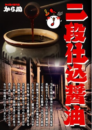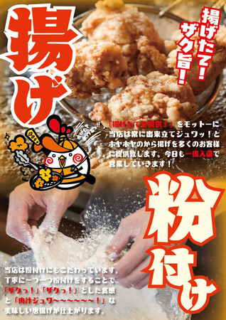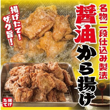 当店名物の醤油から揚げは千葉県香取市で150年以上続く醤油屋である「ちば醤油」の中でも最高級の醤油である再仕込み醤油を使用しております。醤油で更に大豆や小麦を加えて再度醤油を作る2段仕込み製法で作られる光沢のある純度の高い贅沢な逸品を使い1日寝かして鶏肉を漬け込む事で香り高い「ザクッ!」としたこだわりの唐揚げに仕上げました。