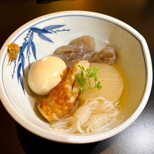 大根、卵、こんにゃく、しらたき、ちくわ(たまに牛すじ入り)のおでんで、秋冬の季節に欲しくなる料理にしました。柚子胡椒とカラシを添えて提供します。