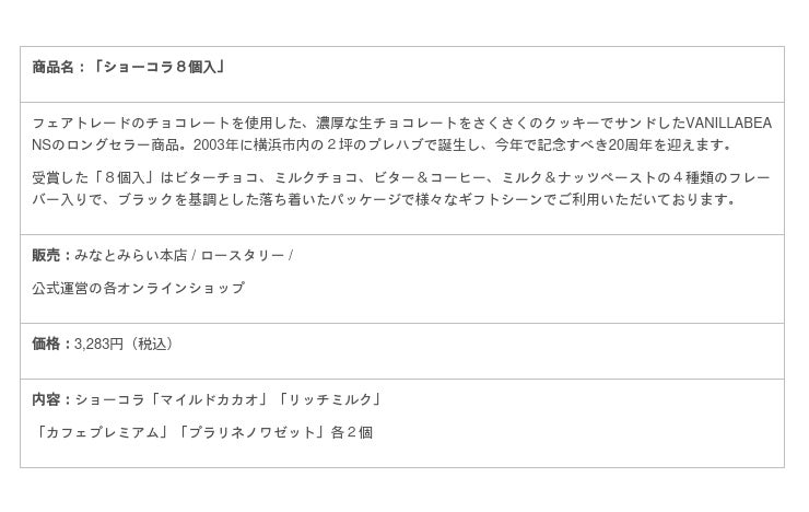 チョコレートデザイン株式会社(代表取締役:八木克尚、本社所在地:横浜市)が運営するブランドVANILLABEANS(バニラビーンズ)の「ショーコラ8個入」が、2023年6月の第64回ジャパン・フード・セレクションにて最高位のグランプリを受賞しました。