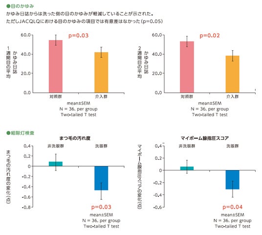 目のかゆみ(上段)、まつ毛の汚れ(下段左)、マイボーム腺指圧スコア(下段右)のアイシャンプーリフレッシュで洗った目(右側)と洗っていない目(左側)の比較