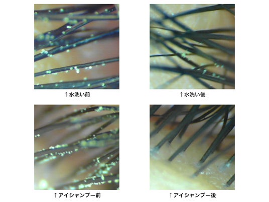 まつ毛についた花粉を水洗いした場合と、アイシャンプーで洗った場合の比較