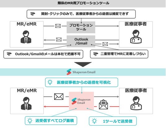「Shaperon Email」は国内初の製薬企業向け双方向型プロモーションツールです。従来のプロモーションツールがプロモーションメールの一括配信しかできなかったのに対し、Shaperon Emailではアポ打診・御礼などの個別メールや医師からの返信も含めて、全てのメールを一元管理する事ができます。それにより、コンプライアンス強化、分析強化、MR業務の効率化が可能です。