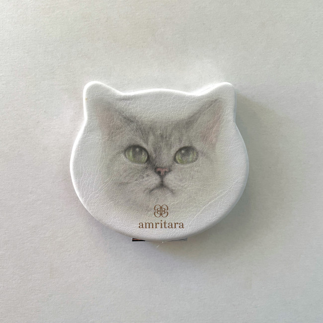 ネコ型の可愛いコンパクトミラーです。高級感のある風合いのヴィーガンレザー(合皮)を使用しています。ミラーは2面あり、ひとつは通常、もう一つは拡大鏡になっており、メイクのときに細部を見るのに便利な仕様になっています。モデルになっている猫はアムリターラ代表・勝田小百合の愛猫リリーです。