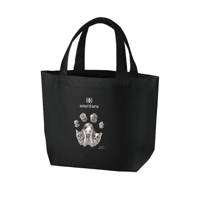マチ付き・内ポケット付きなので、ちょっとしたお出かけにお財布や携帯などを入れるのにぴったりのサイズ感です。染料は「GOTS認証」を取得しているものを使用。モデルになっている猫はアムリターラ代表・勝田小百合の愛猫リリーです。