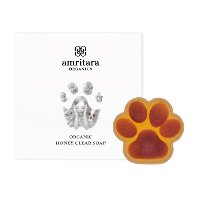 ぷにぷにの肉球部分にはアムリターラの<原生林の黒はちみつ>を使用。インド・メルガート地方の原生林で採蜜されたはちみつを氷温熟成した無濾過の黒い蜂蜜です。原生林に咲く花々や樹液、「森の炎」と呼ばれるパラシュ(ハナモツヤクノ木)という赤い花の蜜などが含まれているので、カリウムなどのミネラル類やその他成分をその分多く含有します。基本的に人間の洗顔用ですが、犬や猫の洗浄用としてもお使いいただけるように無香料です。