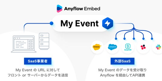 新機能「My Event」では、SaaS事業者のプロダクトから、Anyflow Embed に対して、他社SaaSに連携したいデータを送信することで、公開APIが備わっていないプロダクトにおいても、他社SaaSとのAPI連携を短期間で実現します。