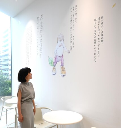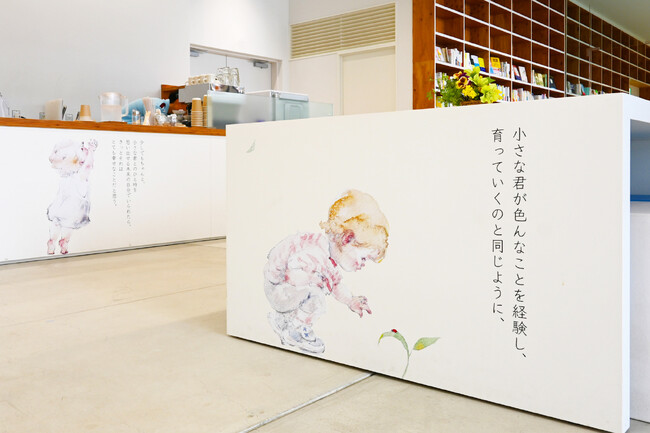 その壁や机など至る所に、詩人・自由丁オーナー小山将平による一篇のエッセイ「小さな君との日々を想う」の言葉たちと、その言葉のイメージを膨らませるような柔らかく瑞々しい水彩画が水彩作家yuukoによって描かれています。