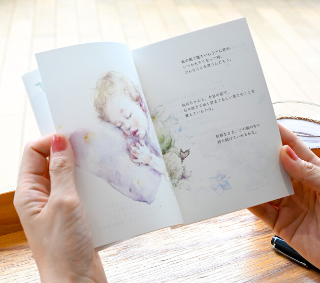 ノートブックの巻頭には本展示のテーマ作品『小さな君との日々を想う』をyukkoのイラストとともに楽しんで頂けるミニ絵本を集録。さらに巻末には会場にも展示されている全国のママパパから寄せられた「未来へ贈りたいエピソード集」を、過去にTwitterで3万イイネを集めた、yukkoによるエッセイと共に掲載しています。