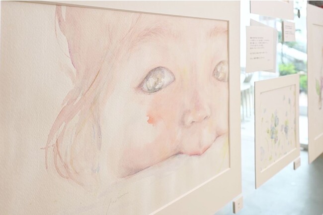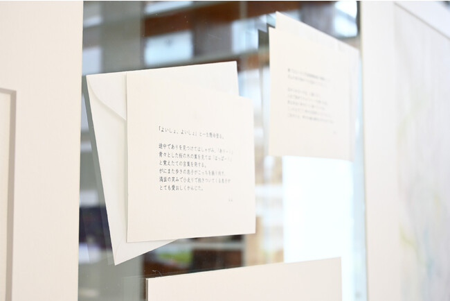 会場を歩いて巡った最後には、これまでに水彩作家yukkoが描いてきた「未来の自分へ贈りたい瞬間」の原画とともに、展示連動企画としてSNSで募集した全国のパパママからの「未来への自分へ贈りエピソード」が展示されています。