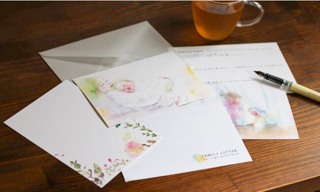 レターセットは、実際に手紙を書くポストカードの他に展示テーマのエッセイ『小さな君との日々を想う』が書かれたカードや、自分や家族のことを振り返るきっかけに使って頂けるリフレクションカード等、手紙を書きやすくするためのアイテムが含まれています。
