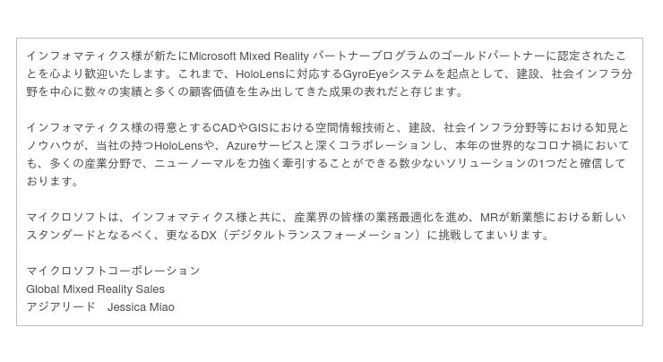 株式会社インフォマティクス(本社:川崎市、代表取締役:齊藤 大地)は、Microsoft Mixed Reality パートナープログラム(MRPP)におけるゴールドパートナーに認定されたことを発表しました。