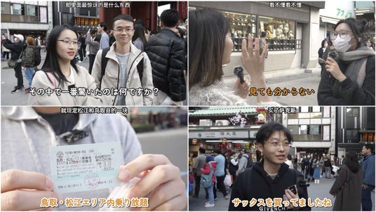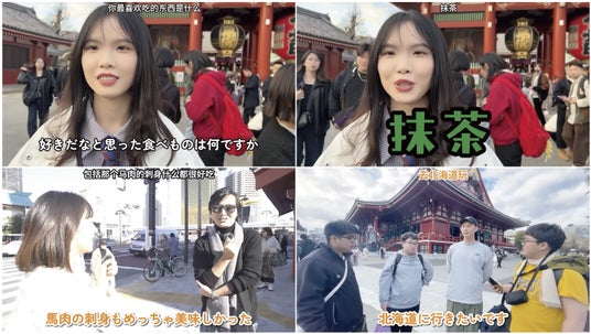 中国語話者や中華圏からの旅行者が対象の街頭インタビュー動画は、現在のところ米国や欧州など英語圏の旅行者を対象とした企画と比べて数が少ないなど、目にする機会が非常に限られていました。本動画シリーズでは、東京・浅草を訪れていた訪日中国人観光客・在日中国人30名以上を対象に、さまざまな角度で日本の印象や魅力、課題に関するインタビューを行いました。北海道の雪景色に感動した女性、大阪の地下鉄が便利だと絶賛するカップル、オタクカルチャーが大好きな男性四人組、人気アニメの聖地巡礼を行う男性、家族連れなど、幅広い属性の中国人に聞き取りを行った様子を、見どころを厳選して、コンパクトに詰め込んだ内容となっています。