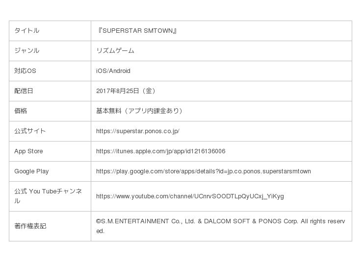 「SUPERSTAR SMTOWN」は、DalcomSoft. Co.,Ltd.(本社:韓国ソウル市、以下「Dalcomsoft」)によって2014年8月にリリースされた音楽ゲームアプリで、SM所属の人気アーティスト達の楽曲を使い、世界累計900万ダウンロードを達成した大人気のリズムゲームです。ポノスはSM、Dalcomsoftと提携し「SUPERSTAR SMTOWN」のローカライズ及びカルチャライズを行い、台湾にも配信しています。