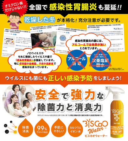 自然由来の貝殻焼成酸化カルシウム「CaO」をベースとした、健康かつ安全な添加物(BiSCaO)を原材料として作られたカルシウムイオン水(Ca2+)です。人工の化学物質・アルコール・化学薬品は一切使用せず、動植物・自然環境にも優しくウイルス・細菌・耐性菌・カビ除去・消臭に優れ、どの除菌剤製品よりも強力で圧倒的に優 れた効果が証明されています。お子さまからお年寄りの方、妊娠中の方、病気療養中の方、ペット、アルコールアレルギーの方など、安心安全にお使いいただけます。ダイヤモンドプリンセス号や大阪コロナ重症センターの