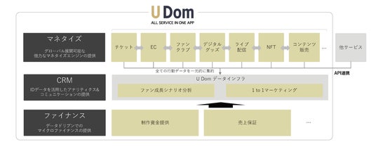 「U Dom」はメンバーシップ/コミュニティ/チケット/グッズ/デジタルグッズ/ライブストリーミング/デジタルコンテンツ/NFTなどファンビジネスに必要な機能をオールインワンで揃えています。今後、一元的に蓄積したファンの活動データを活用して、スーパーファンへの1to1マーケティングや、アーティスト活動への資金提供などの事業を展開してまいります。
