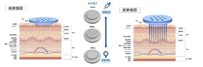 当社は、元々光学・電気技術を用いた医療機器及び検査測定機器等の 開発・製造を専門に行う企業です。そこで培われた光学レーザー技術を医療・美容分野に役立てたいという思いから生まれたのがホローマイクロニードルです。まず、当社は医療用マイクロニードルの研究開発をスタートさせましたが、その過程で、美容用マイクロニードルの開発にも着手し、痛くない、角質層を超えない美容用マイクロニードルを完成させました。このホローマイクロニードルを搭載した化粧品「セレイア」が実現した新しいデリバリーシステムは、従来の化粧品では困難だった「様々な美容成分(美容カクテル)」を「肌の奥まで※1」届けます。肌に傷をつけず、角層の奥まで届く長さ(0.2mm)にしている点が医療用と大きく異なります。
