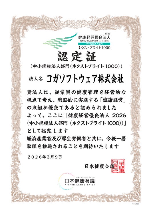 システム開発のコガソフトウェア株式会社は、 健康経営(R)・健康づくりの取り組みを積極的に行っている企業として、2026年3月9日付けで経済産業省と日本健康会議が選定する「健康経営優良法人2026(中小規模法人部門(ネクストブライト1000)」に7年連続で認定されました。