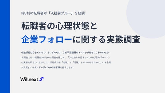 株式会社ウィルネクスト(本社:東京都港区、代表取締役社長:中村真広)は、調査レポート『転職者の心理状態と企業フォローに関する実態調査』を無料公開いたしました。
