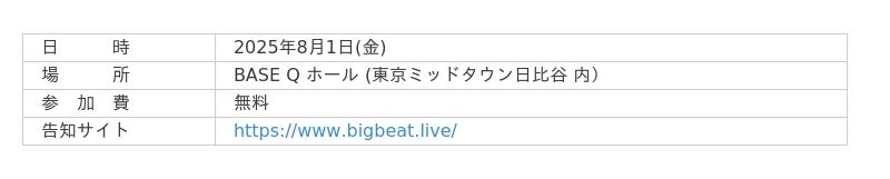 広告事業・イベント支援事業を展開する株式会社ビッグビート(代表取締役:濱口 豊、以下ビッグビート)は、2025年8月1日(金)に「Bigbeat LIVE 2025」を開催することをお知らせいたします。2017年に初めて開催した同タイトルのイベントは今年で5回目、5年ぶりの開催となります。