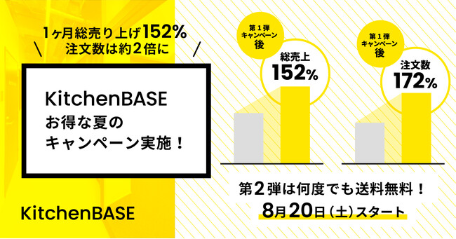 全国で約200のキッチンを持つ、客席のないクラウドキッチンを運営するKitchenBASE。フードデリバリーが広がり大手も参入する中、アプリでいかに見てもらえるか、選ばれるかが重要になっています。そんな中、8月20日~大手デリバリーサービスWoltで夏のキャンペーンを実施いたします。第1弾は1ヶ月で売上152%、注文数は約2倍に!