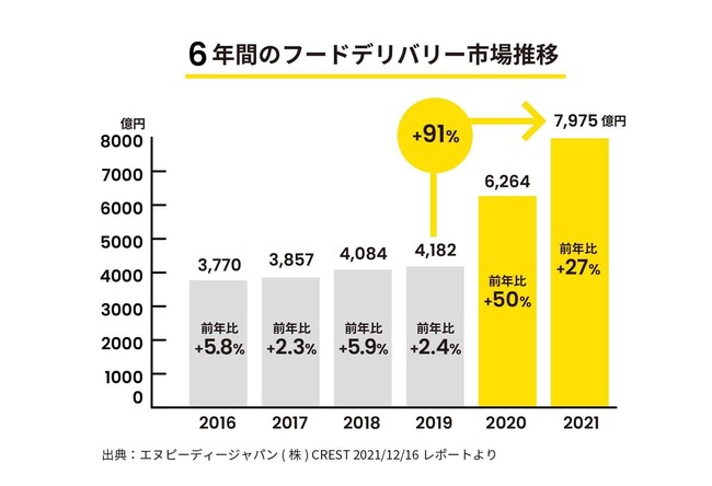 コロナ禍で注目を集めるフードデリバリー。今や自炊や外食と並ぶ「食の選択肢の一つ」として人々の生活にとけこみ、日々様々なお店がオープンしています。2019年には4000億円規模だった国内のデリバリー市場は、2021年には約2倍の8000億円まで拡大。