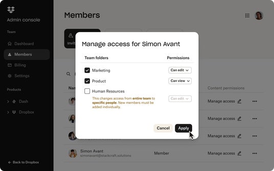 Dropbox Dashには高度なセキュリティ機能が搭載されており、アクセス権限の一元管理と検索結果から機密情報の除外ができるようになりました。これにより、IT管理者にとって必要不可欠である、誰が何を閲覧できるかの管理が簡単になります。