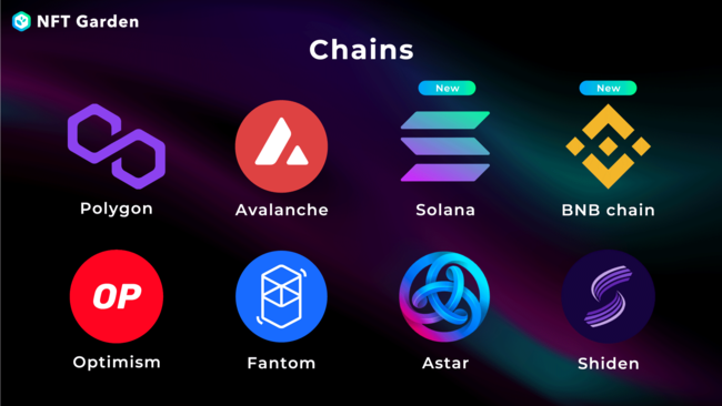 世界最大のNFTマーケットプレイス『OpenSea』では直近のアップデートにて、『Solana』『Avalanche』『Optimism』『BNB chain』などのチェーンに対応したNFTの取り扱いを開始しております。これらのチェーンはOpenSeaが対応を行う以前に『NFT Garden』で対応を進めていたものが多く、『NFT Garden』で対応済みのチェーンがマーケットプレイス側で追加対応される事により、『NFT Garden』にNFT生成機能を集約した際の利便性が更に高まります。